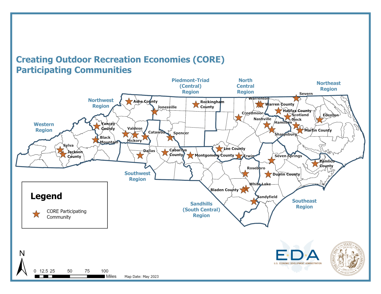 In January 2023, the N.C. Department of Commerce, Rural Economic Development Division, announced that 34 communities from across the state would participate in the Creating Outdoor Recreation Economies (CORE) program. The CORE program, which is funded by a U.S. Economic Development Administration State Tourism Grant, offers strategic planning and technical assistance to help rural North Carolina communities leverage the state’s abundant outdoor recreation assets to support local economic growth.