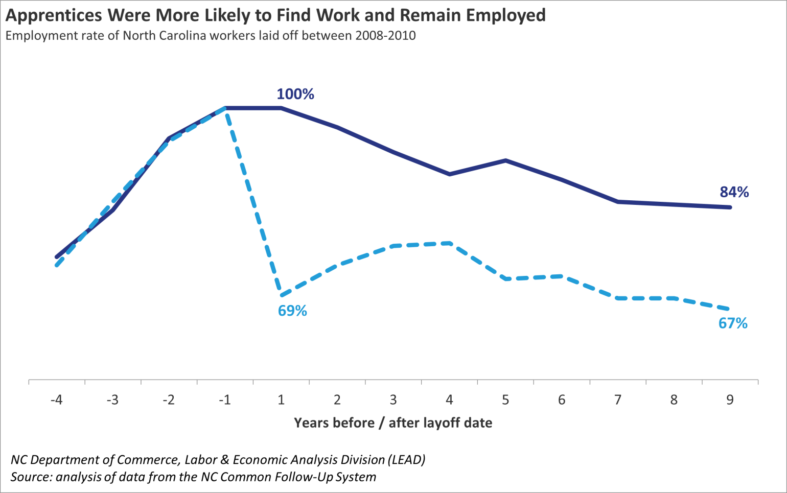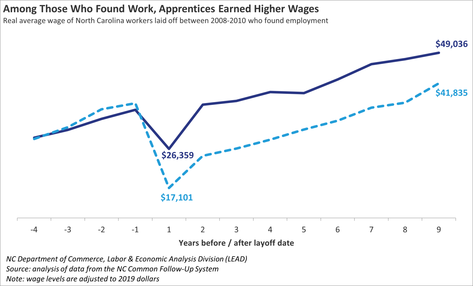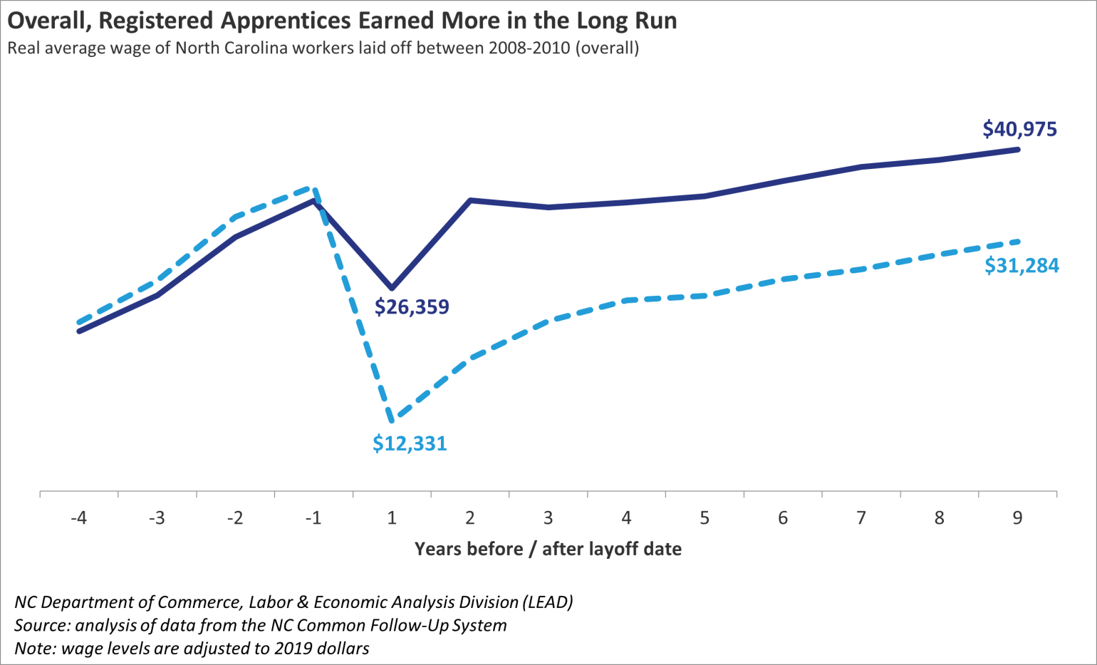 By showing that registered apprenticeship makes workers better off than they would have been otherwise, our study adds to a growing body of evidence that uses North Carolina’s CFS data and scientific research methods to determine “what works in workforce”.
