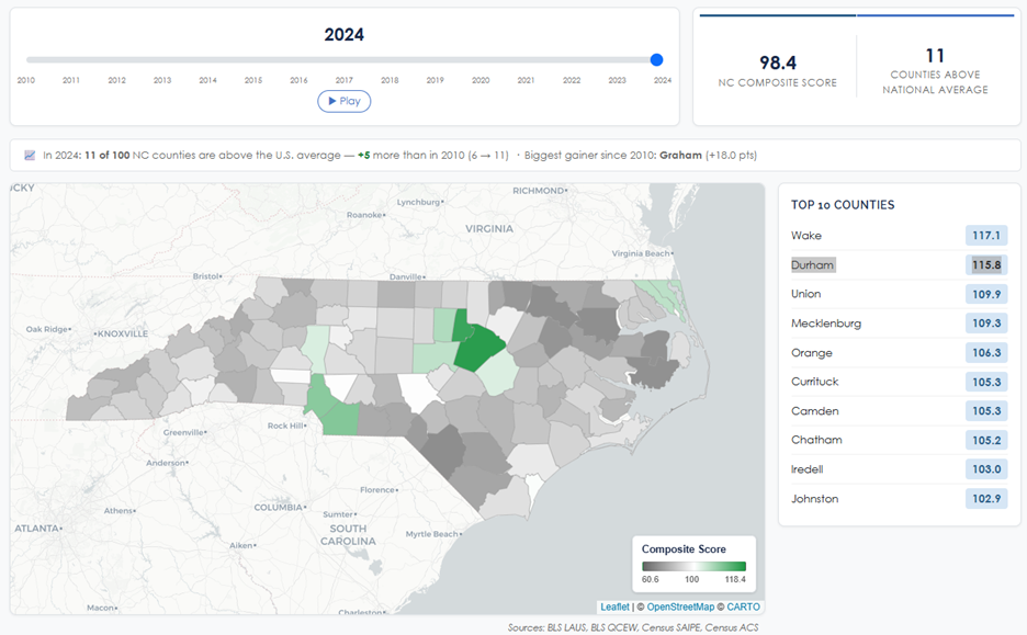Last month, LEAD introduced the County Economic Vitality Index — a composite measure of the economy for all 100 North Carolina counties. Scores are benchmarked annually against the U.S. average across unemployment, wages, median household income, and educational attainment. We also shared 10 key findings from the data revealing patterns in NC's economic geography.