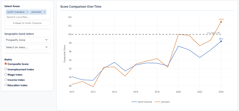 - Area Profile — Click any county from the statewide map (or select from a dropdown) to see 2024 date for the area and U.S., plus trend graphs for its composite score and unemployment, wage, income, and education indices. This should illustrate the components driving the overall score and their trends.