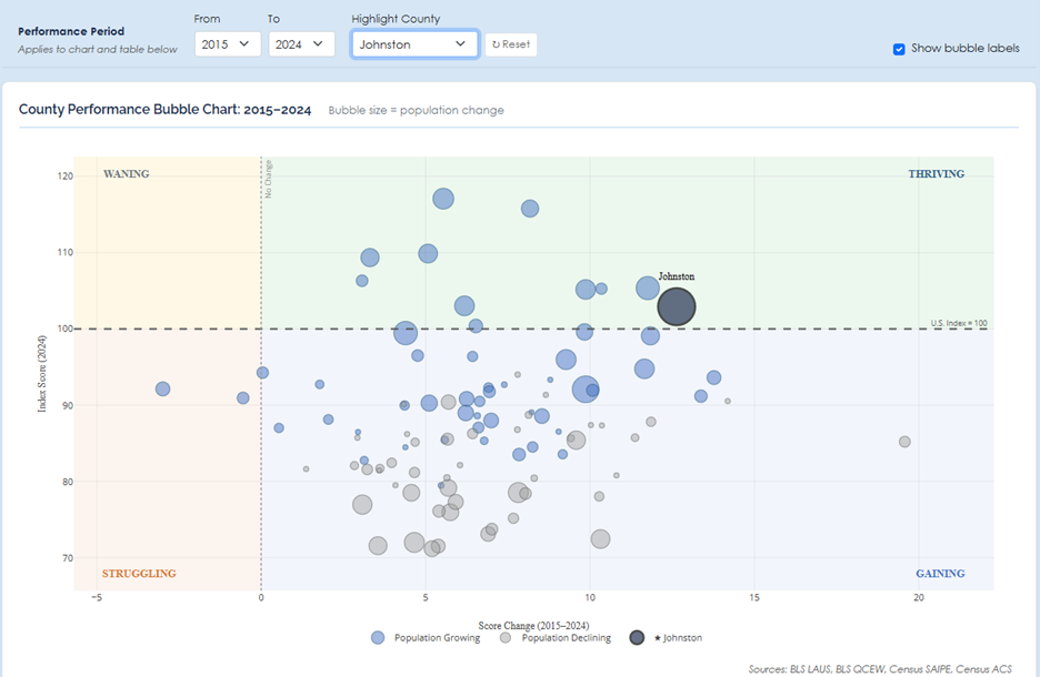 The dashboard is designed for a broad audience — economic developers, local officials, researchers, and curious residents alike. Because every county score is benchmarked to the same national standard, you can make meaningful comparisons across counties. A county's current score tells you where it stands, but scores across 15 years reveal trends and how local conditions are improving or weakening compared to national norms.