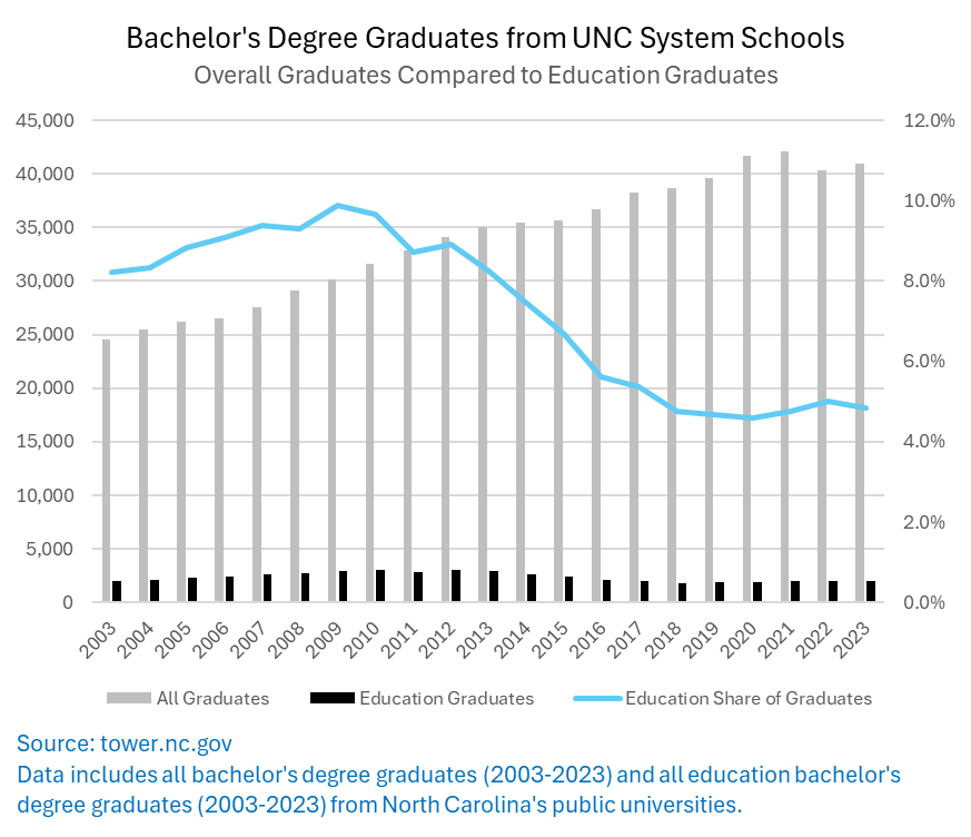Education majors’ share of UNC System bachelor’s degree recipients during this period peaked in 2009 at 9.9%, then began a general decline to 4.6% in 2020. Considering that most students take 4-6 years to complete a bachelor’s degree, this suggests that student preferences started shifting away from education majors in the mid-2000s. Since 2020, the number of education graduates has increased to some extent, although the overall trends indicate changing student interests within the UNC System schools.
